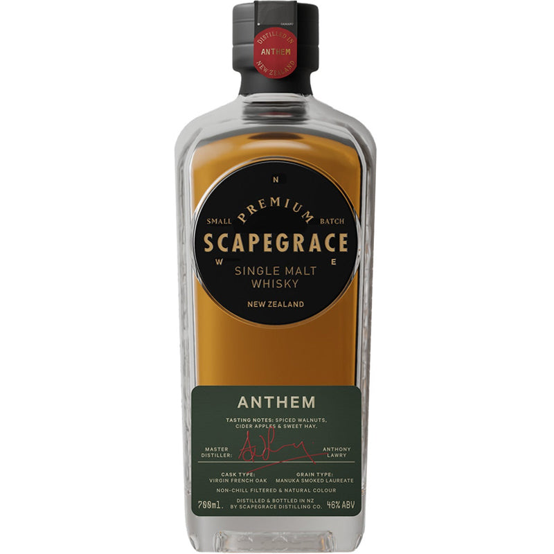 Scapegrace Anthem is a single malt whisky with a uniquely New Zealand rhythm. Crafted with Manuka smoked Laureate grain and matured in virgin French oak, it captures the rugged harmony of Aotearoa’s climate and land. This limited edition is smoky, spiced and seriously smooth - a bottle that sings with character.